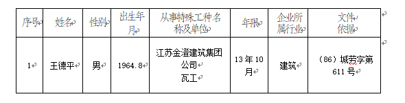 经审查,我单位2022年01月拟申报特殊工种提前退休职工1名,根据人社部发〔2018〕73号文件规定,现将拟申报特殊工种提前退休人员基本情况予以公示,公示时间7天(2022年01月18日至01月24日)。如有异议,请在公示期内向单位(举报电话:0510-88027317)反映情况。