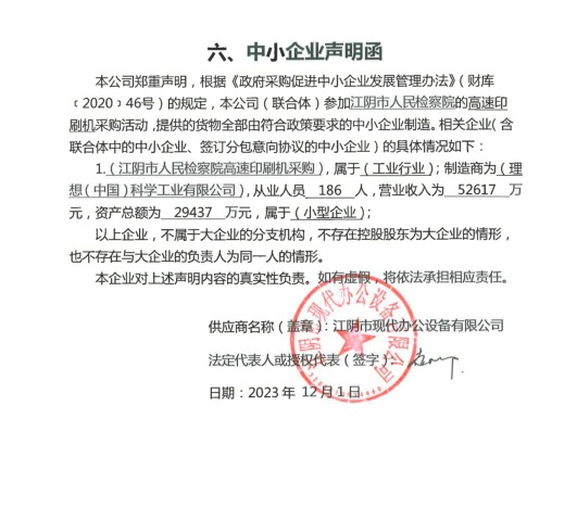 江阴市现代办公设备有限公司《中小企业声明函》