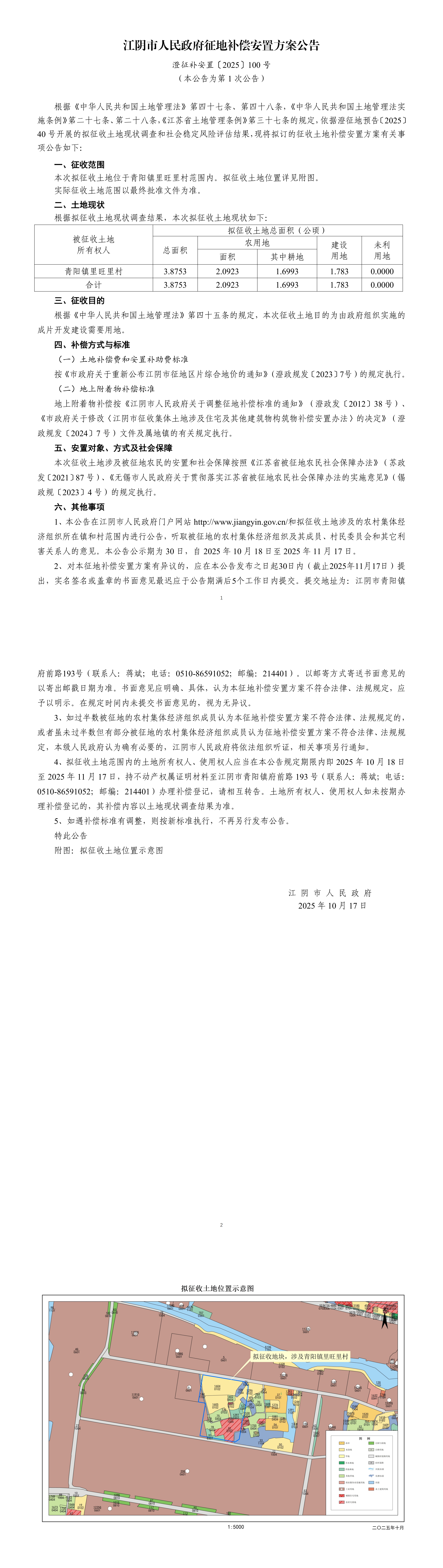 江阴市人民政府征地补偿安置方案公告 澄征补安置〔2025〕100号