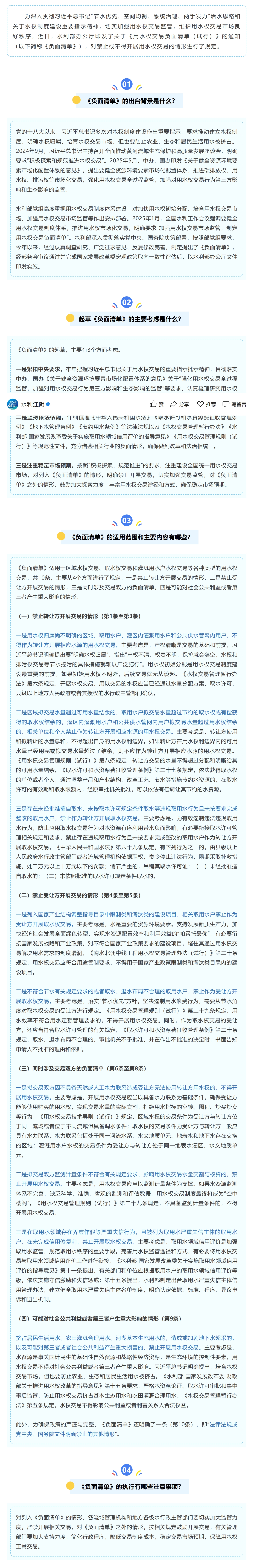 | 内容概述 | 为深入贯彻习近平总书记“节水优先、空间均衡、系统治理、两手发力”治水思路和关于水权制度建设重要指示精神,切实加强用水权交易监管,维护用水权交易市场良好秩序,近日,水利部办公厅印发了关于《用水权交易负面清单(试行)》的通知(以下简称《负面清单》),对禁止或不得开展用水权交易的情形进行了规定。 | ||||