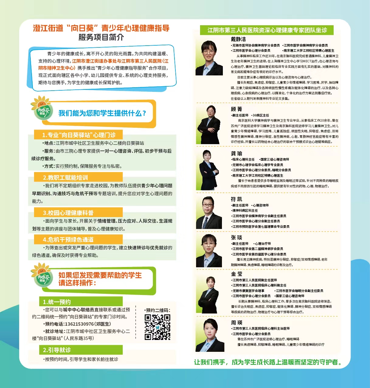 为深入贯彻落实国家“儿科和精神卫生服务年”(2025—2027年)部署,推进医教协同、关爱青少年心理发展,今年9月,市第三人民医院联合澄江街道在城中社区卫生服务中心设立“向日葵驿站”青少年心理健康服务门诊,双方签署“青少年心理健康指导服务”合作协议,由医院选派资深心理专家定期进驻社区,为青少年提供情绪障碍、学习困难、儿童孤独症等问题的专业咨询与治疗服务。