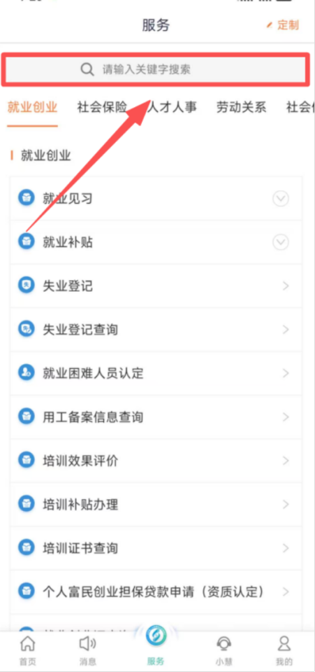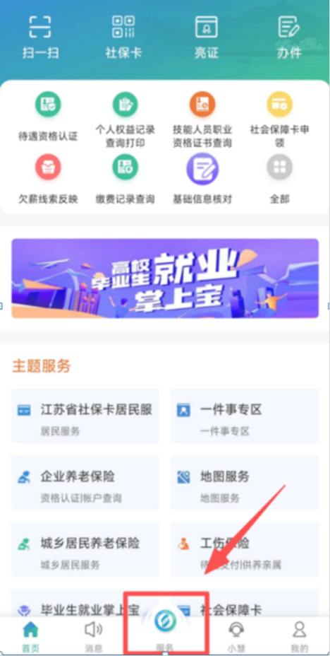 第一步:登录“江苏智慧人社”APP或小程序,点击“服务”选项。