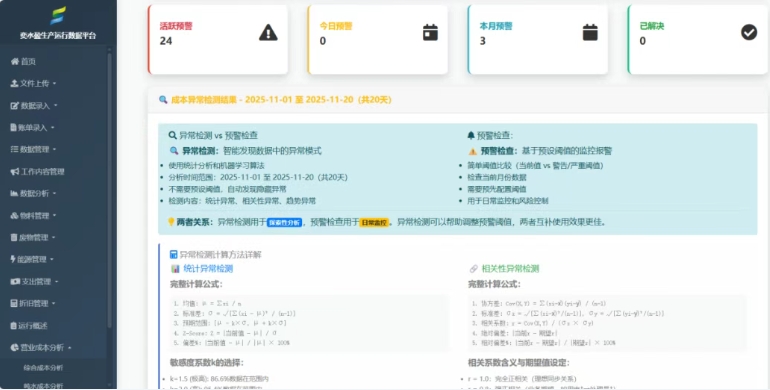 为强化“近零排放”管控,公司技术部自主研发“奕水盈污水处理管理系统”。该系统以Python+Flask架构本地化部署,实现全流程数据实时采集与智能分析。其四大核心功能精准赋能:自动化报表与趋势图生成解放人力,节省工时聚焦工艺优化;“双口径核算”切换厂内水表流量与园区客户水表流量的吨水成本算法;动态预警及时排查每日成本异常,规避水质波动;多维度分析优化能耗、物料库存。系统使运营效率提升20%以上,筑牢数字化管控根基。