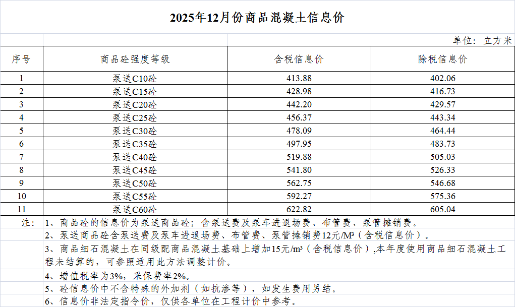 2025年12月份商品混凝土信息价