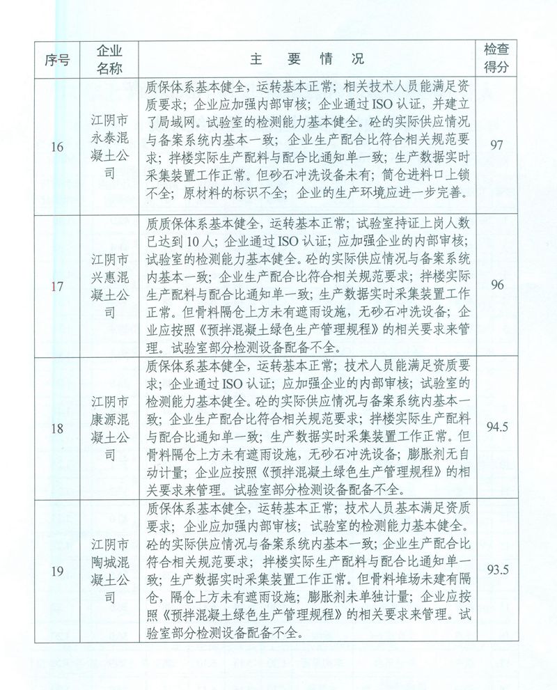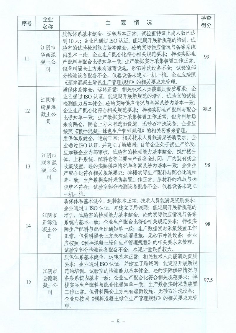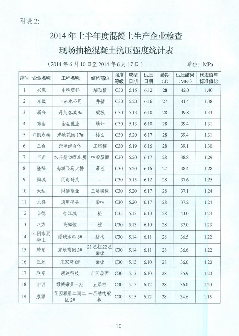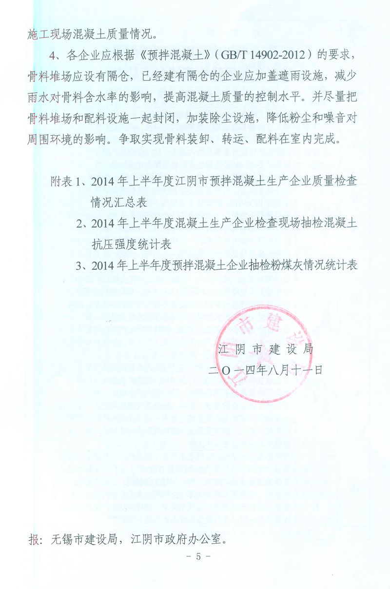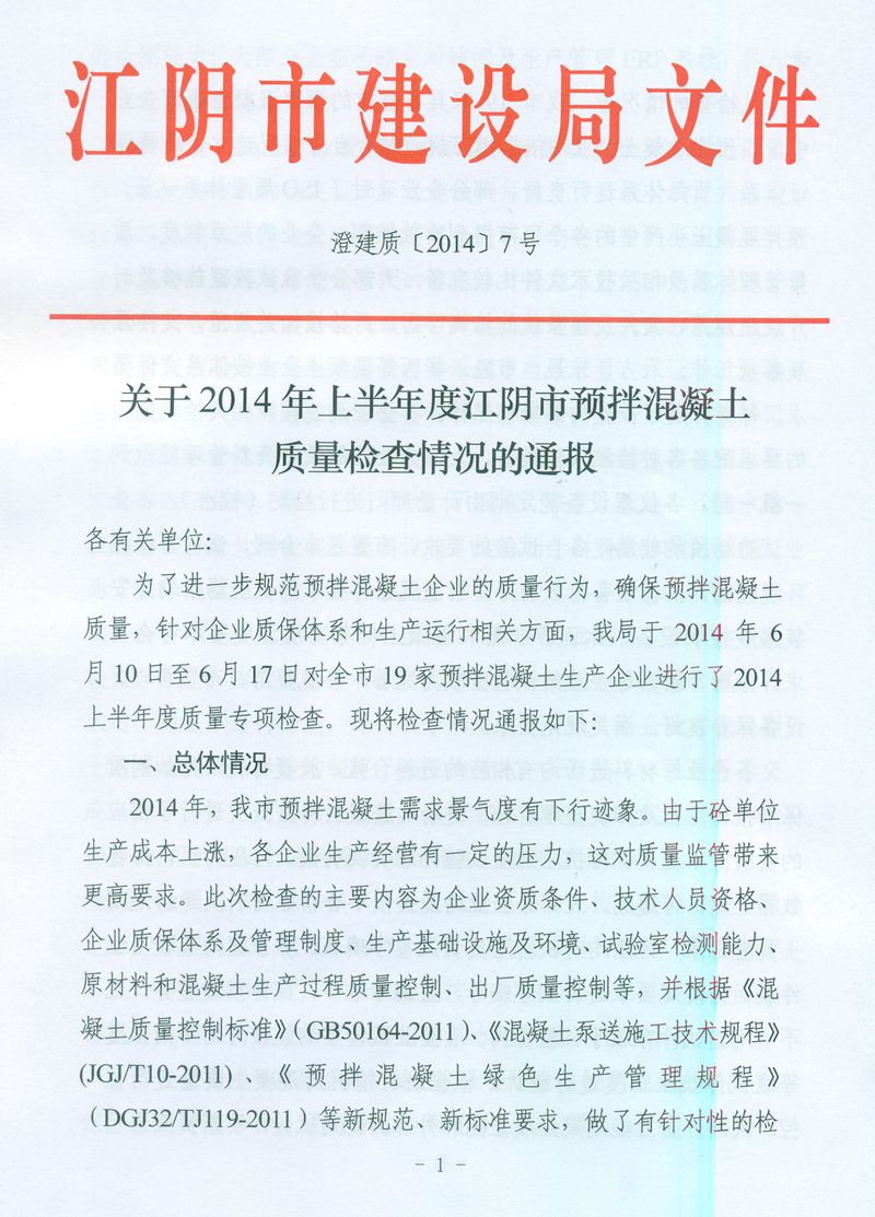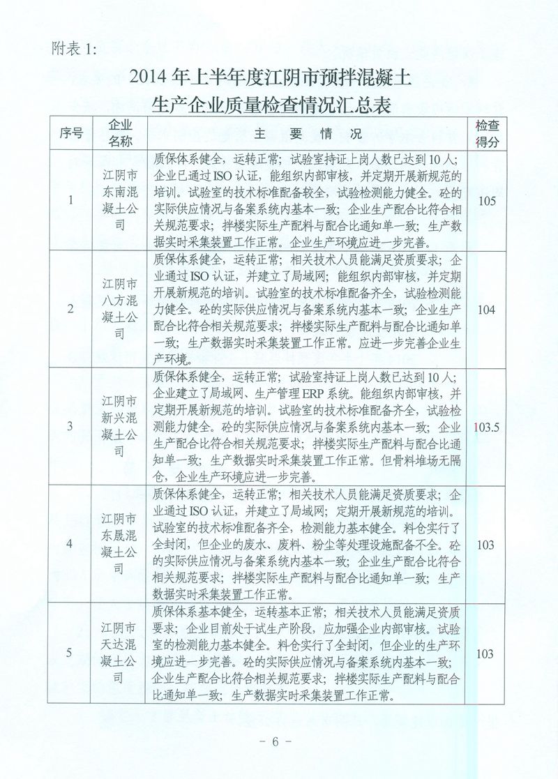 关于2014年上半年度江阴市预拌混凝土质量检查情况的通报