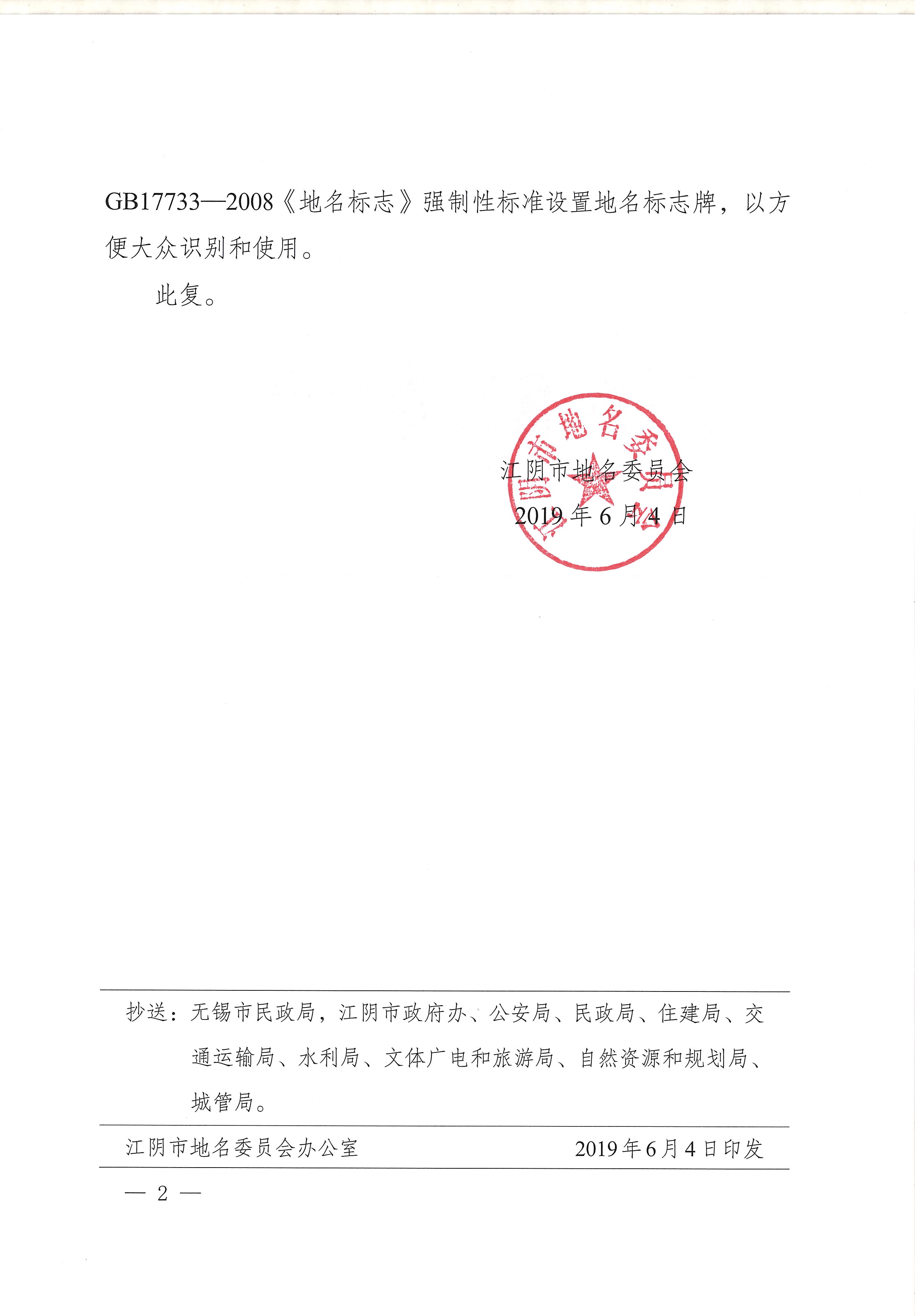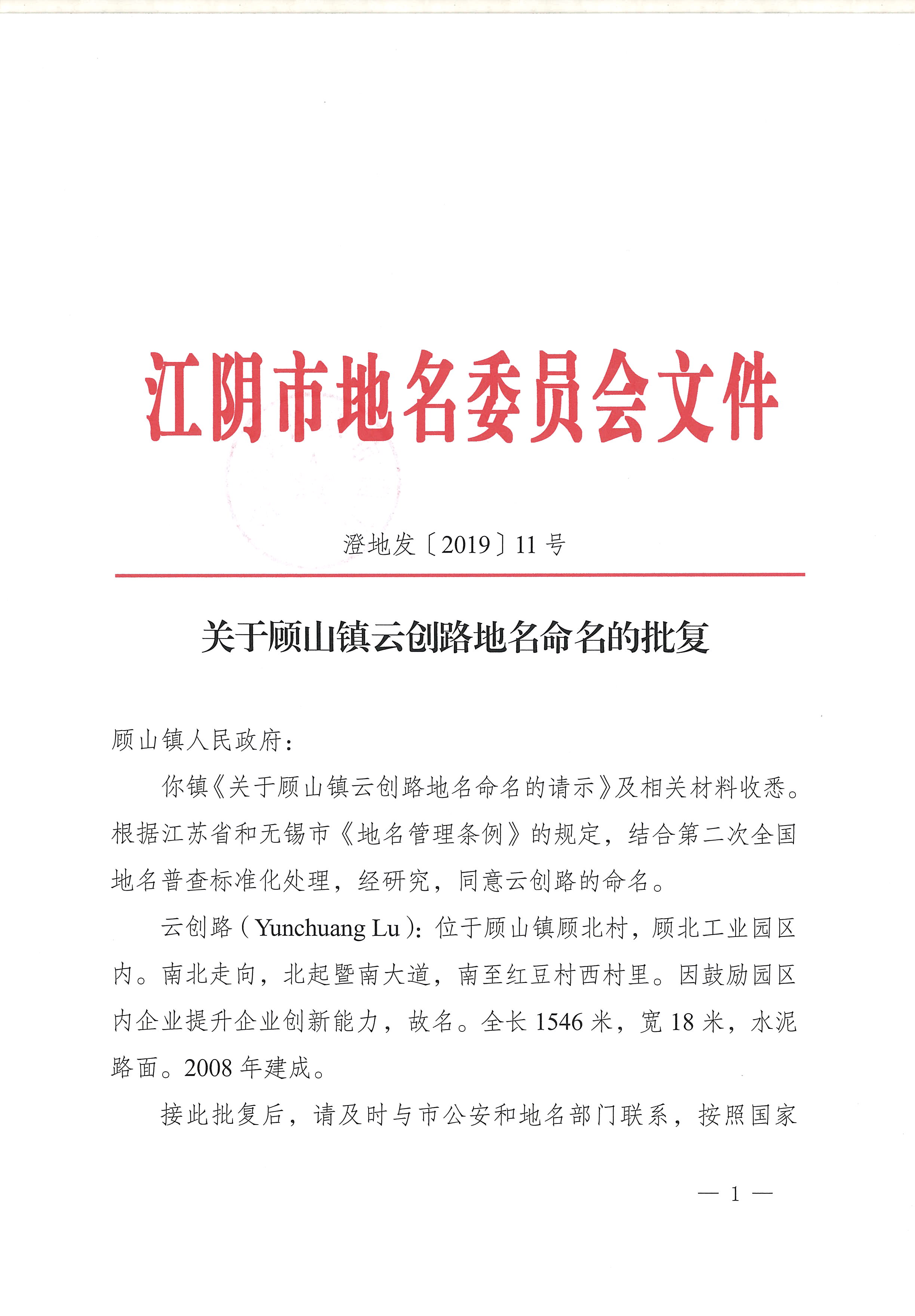 | 内容概述 | 青阳镇人民政府: 你镇《关于顾山镇云创路地名命名的请示》及相关资料收悉。根据江苏省和无锡市《地名管理条例》的规定,结合第二次全国地名普查标准化处理,经研究,同意云创路的命名。 | ||||