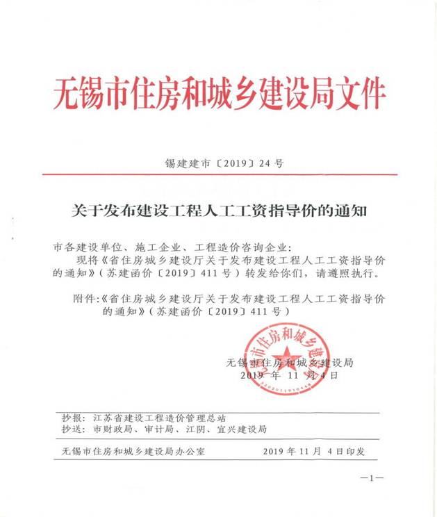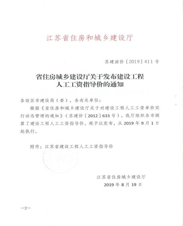 附:《省住房城乡建设厅<关于发布建设工程人工工资指导价的通知>的通知》(苏建函价〔2019〕411号)