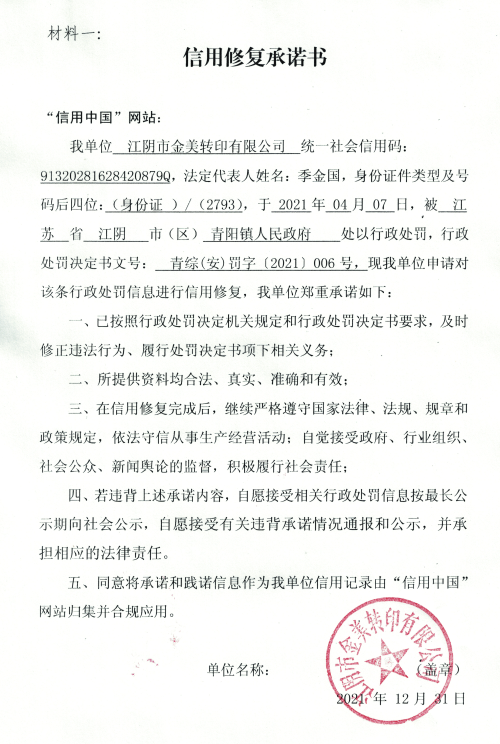 信用修复承诺