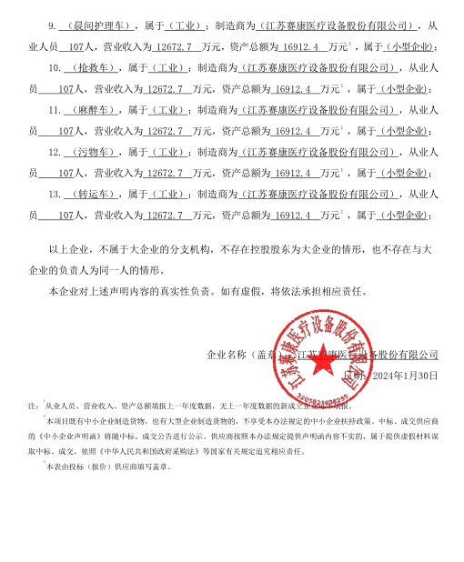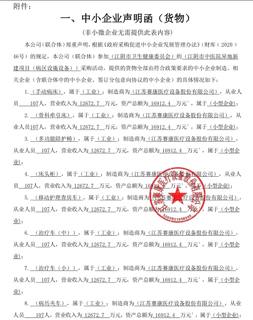 江苏赛康医疗设备股份有限公司《中小企业声明函》。