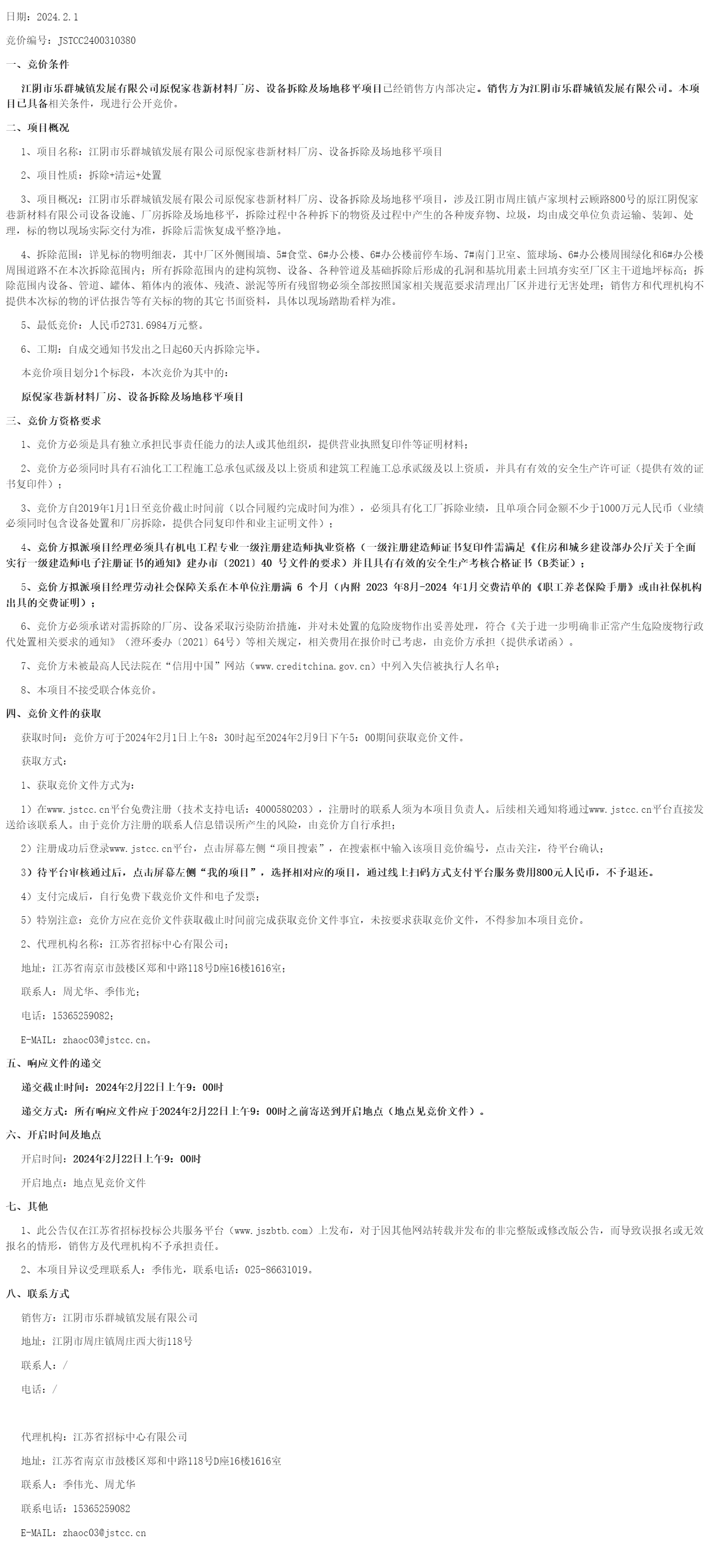 1、项目名称:江阴市乐群城镇发展有限公司原倪家巷新材料厂房、设备拆除及场地移平项目