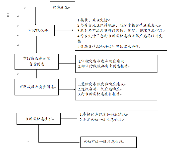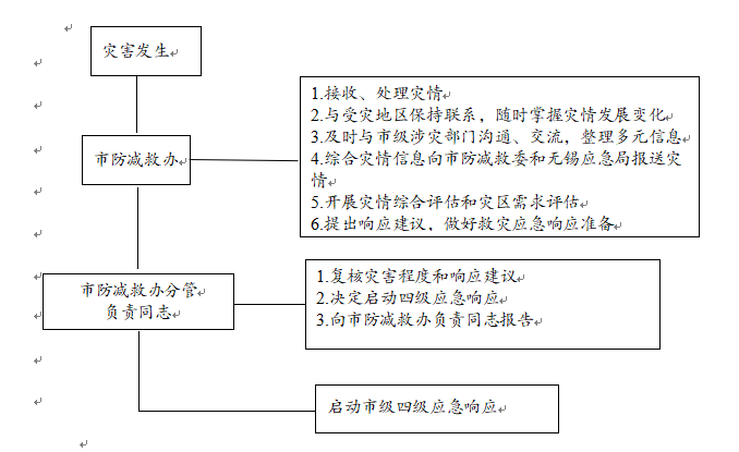 灾害发生后,市防减救办经分析评估,认定灾情达到启动条件,市防减救办分管负责同志决定启动四级响应,并向市防减救办负责同志报告。启动市级四级应急响应按照以下流程进行: