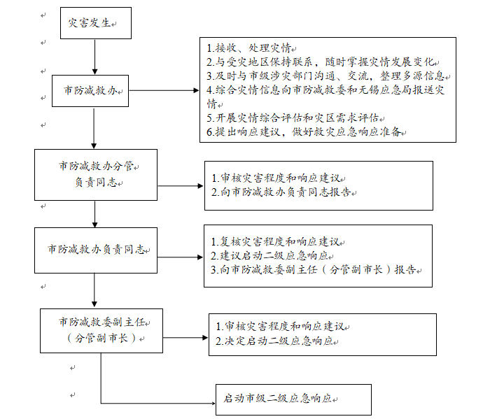 灾害发生后,市防减救办经分析评估,认定灾情达到启动条件,向市防减救委提出启动二级响应的建议。市防减救委副主任(分管副市长)决定启动二级响应,并向市委、市政府报告。启动市级二级应急响应按照以下流程进行: