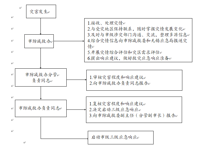 灾害发生后,市防减救办经分析评估,认定灾情达到启动条件,向市防减救办主要负责同志提出启动三级响应的建议。市防减救办主要负责同志决定启动三级响应,并向市防减救委副主任报告。启动市级三级应急响应按照以下流程进行: