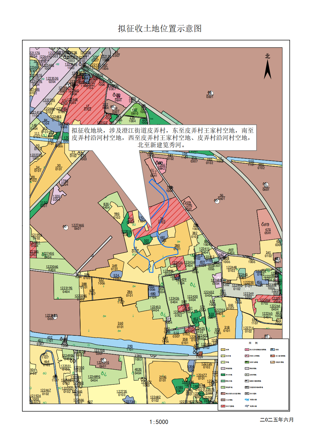 本次拟征收土地位于澄江街道皮弄村,东至皮弄村王家村空地,南至皮弄村沿河村空地,西至皮弄村王家村空地、沿河村空地,北至新建览秀河范围内。拟征收土地位置详见附图。