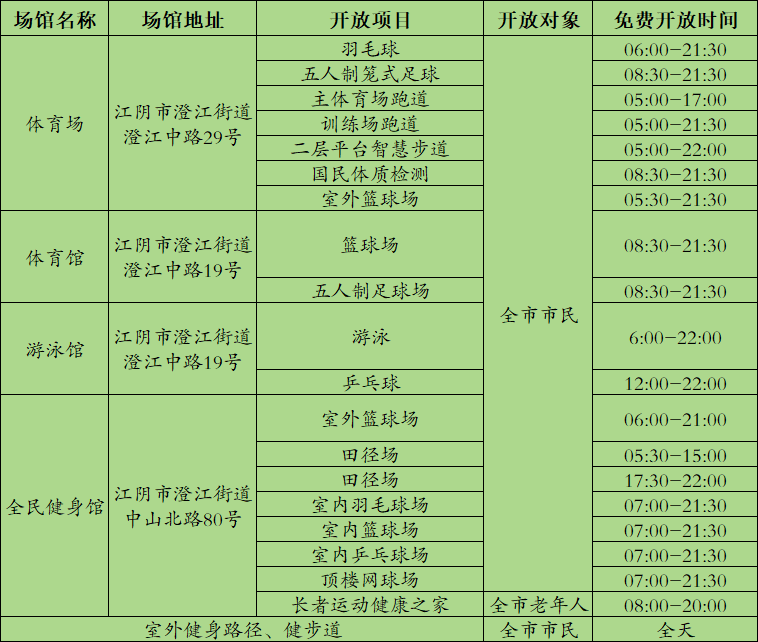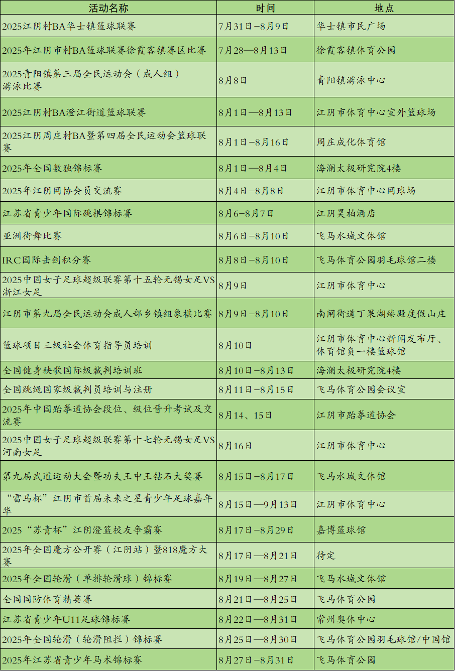 | 内容概述 | 自2009年首个“全民健身日”设立以来,8月8日已成为健身爱好者共同的“节日”。在第17个“全民健身日”来临之际,江阴推出一系列群体赛事活动、培训、运动促进健康服务,鼓励人们更广泛地走出家门、走向运动场,一起动起来!一系列群体赛事活动涵盖了不同年龄段、不同运动喜好的人群,旨在满足广大市民多样化的健身需求,让更多人参与到体育锻炼中来。 | ||||