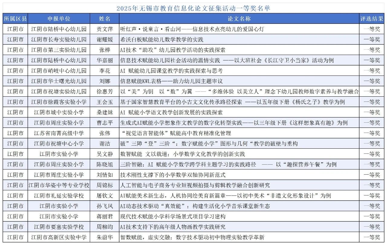 近日,2025年无锡市教育信息化论文征集活动获奖名单公布。江阴市以总数100篇获奖的优异成绩脱颖而出,获奖篇数位居无锡全市前列,其中一等奖21篇、二等奖29篇、三等奖50篇,多篇论文被选送参加省级论文征集活动。江阴市教育信息化和装备管理服务中心荣获优秀组织奖,充分彰显了江阴教师在教育信息化研究与实践领域的深厚底蕴与创新活力。