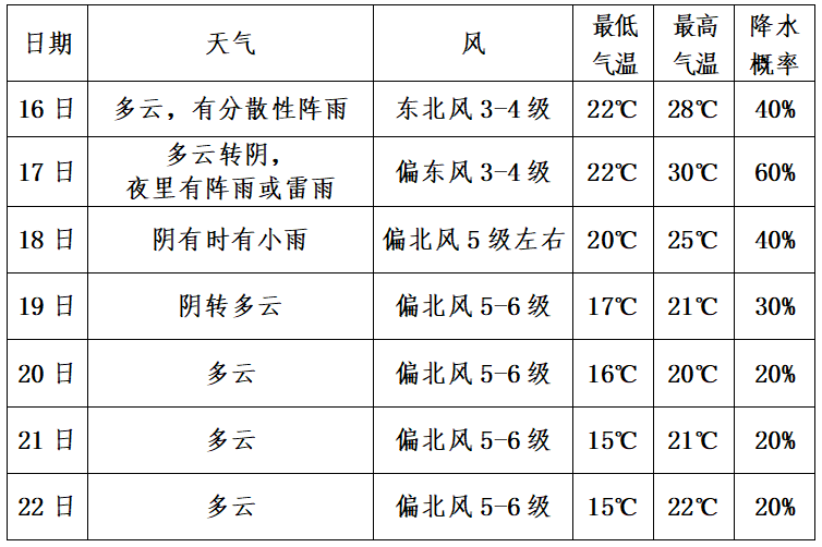 据最新气象资料显示,未来三天我市仍多阵雨天气,19日起天气转好,以多云天气为主。16-17日副高再次增强,预计我市气温将有所回升,17日最高气温升至30℃左右;17日夜里起将有一次冷空气过程,受其南下影响,我市将有一次大风降温过程,18-22日偏北风力较大,最高气温降至21℃左右。