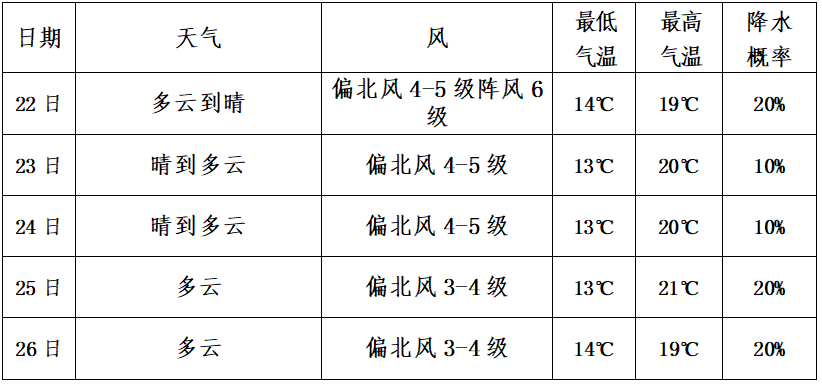 据最新气象资料显示,22-25日以晴好天气为主,早晨气温偏低,白天气温逐步小幅上升;预计26日后期还有一股弱冷空气南下,最低气温将进一步下降。请注意防范。