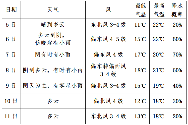 据最新气象资料显示,明天我市晴到多云;6日云系增多,6日傍晚至 8日多小雨过程;9日天气逐步转好。气温方面:未来几天最高气温变化不大,5日早晚较凉,6日起早晚气温有所升高;9日后期受冷空气影响,气温将再次下降。请抓好有利天气,加快秋收秋种进度。