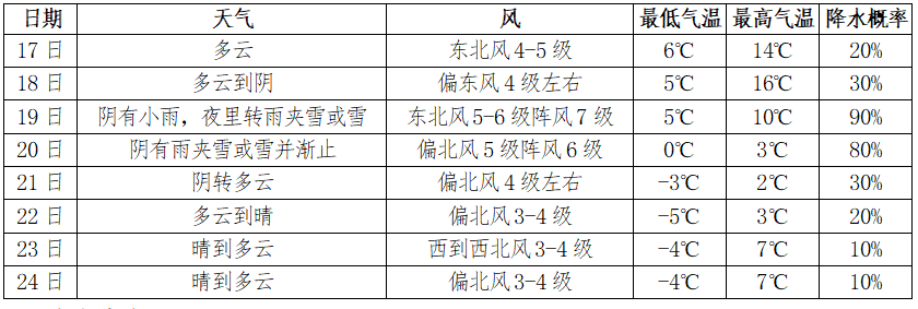 根据最新气象资料分析,下周前期我市有寒潮雨雪,后期有连续冰冻。气温:17-18日最高气温在14℃以上。19日夜里起冷空气影响我市,48小时最低气温降幅8℃左右(达到寒潮蓝色预警信号标准),21-24日有连续低温冰冻。天气:17-18日以云系变化为主;19日白天阴有小雨,夜里转雨夹雪或雪,20日阴有雨夹雪或雪并渐止,部分地区有短时积雪;21日起以晴冷天气为主。风力:受冷空气影响,19-20日我市有5-6级、沿江江面7-8级的偏北阵风。 具体预报如下: