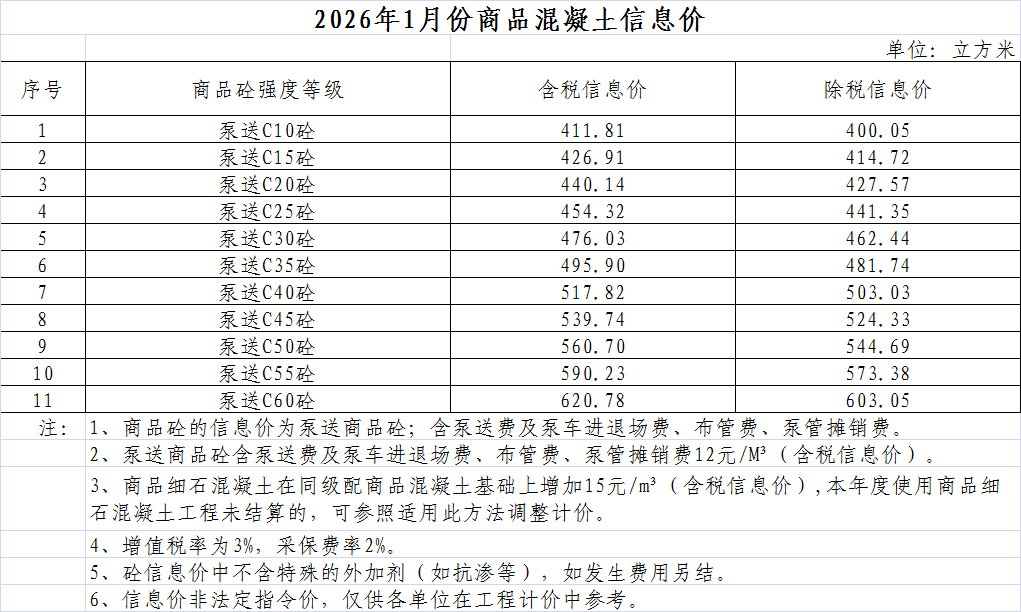 2026年1月份商品混凝土信息价