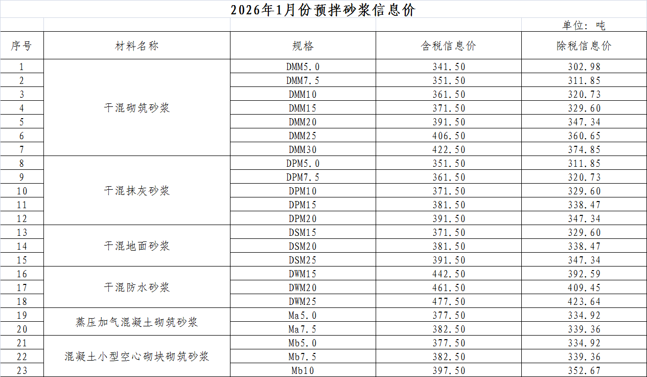 2026年1月份预拌砂浆信息价