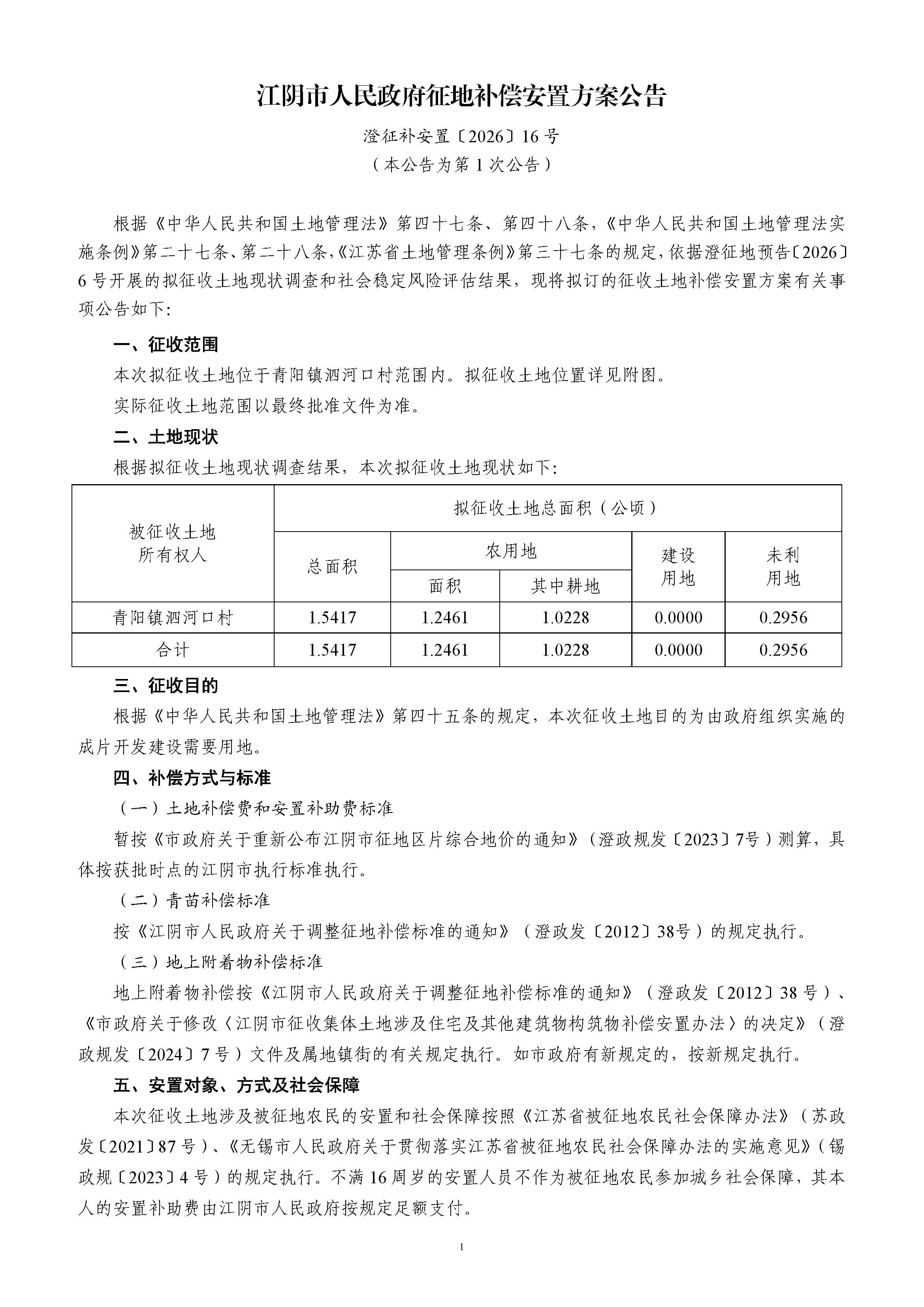 江阴市人民政府征地补偿安置方案公告(澄征补安置〔2026〕16号)