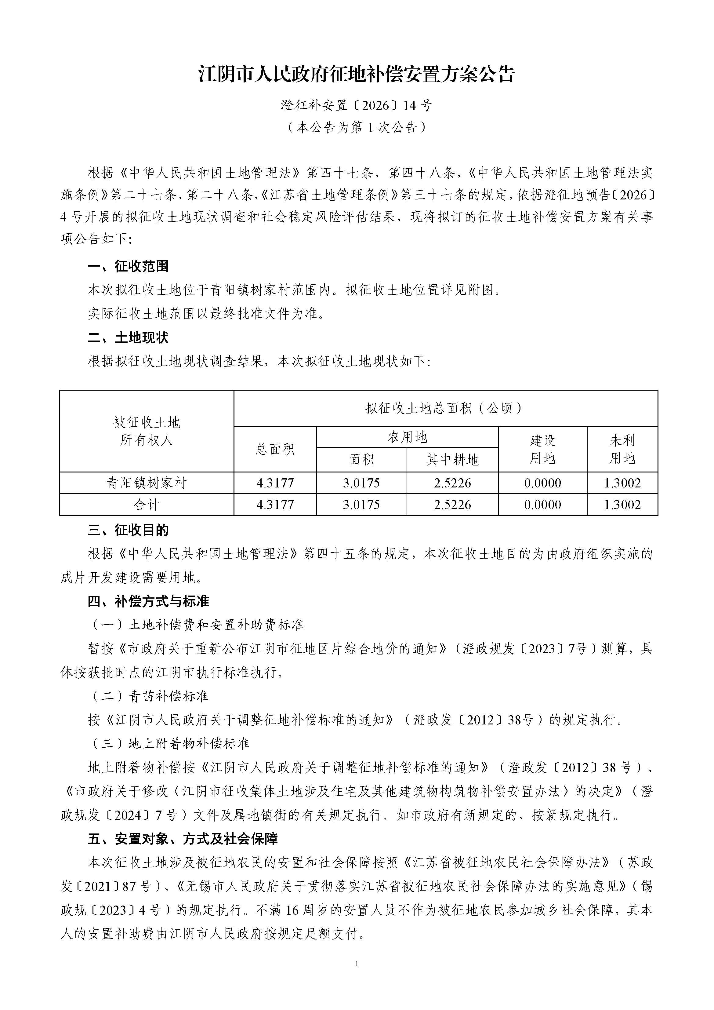 江阴市人民政府征地补偿安置方案公告(澄征补安置〔2026〕14号)